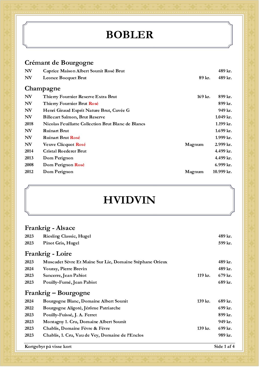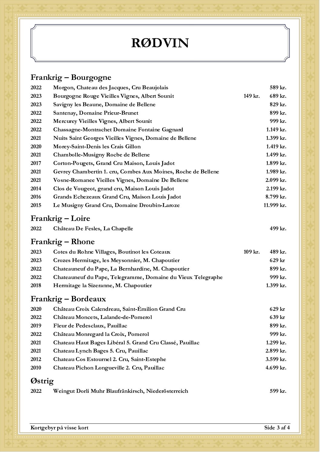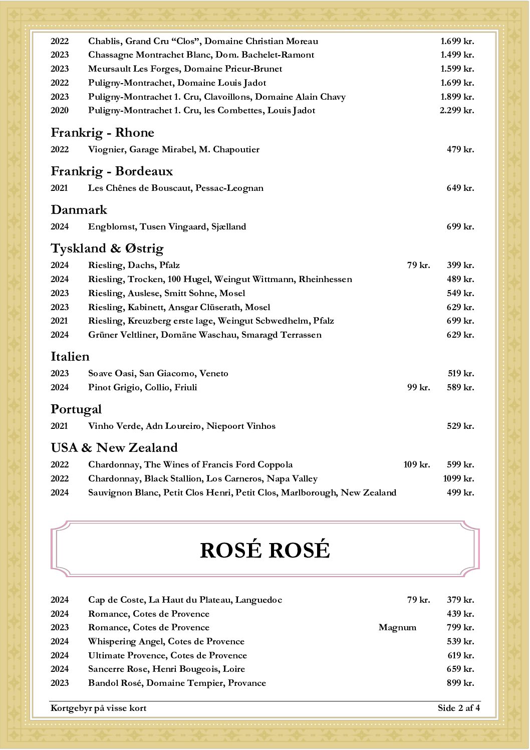 Rosé Rosé har et bredt vinkort, især Bourgogne og Bordeaux men også øvrige Frankrig, Europa og oversøiske vine. Vi har altid mindst 20 vine på glas. Se udvalget her. Klik på billederne for bedre opløsning.